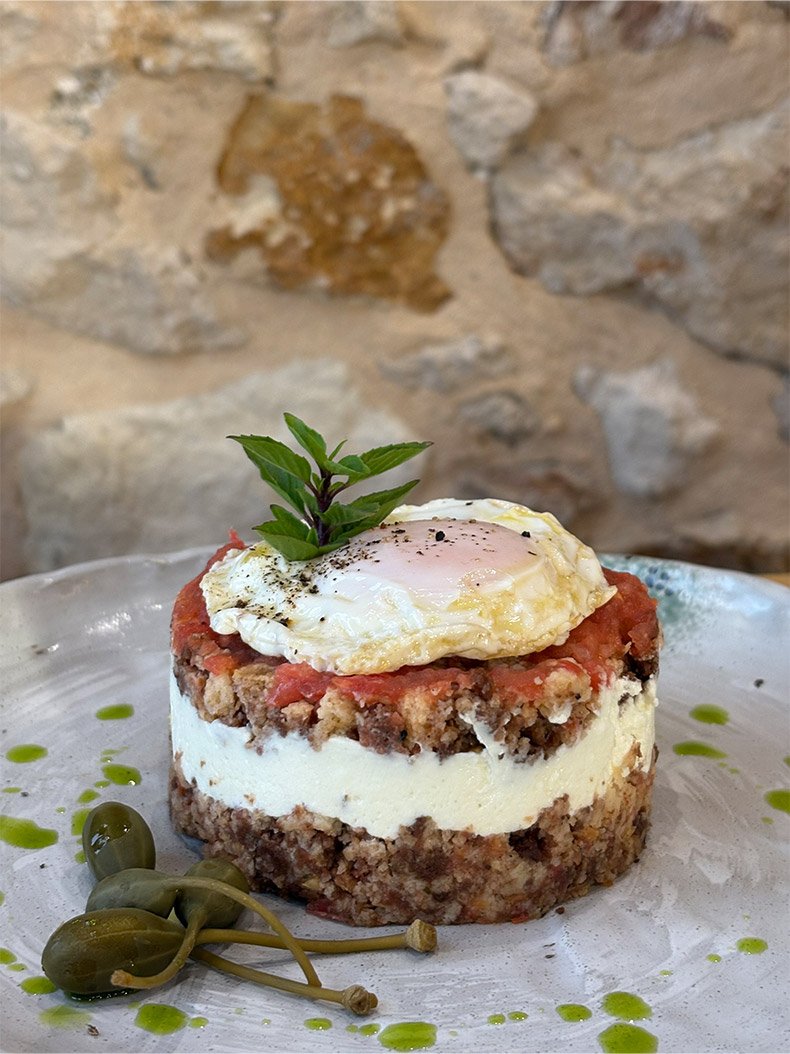 Βιολογικό αυγό, Παξιμάδι κρίθινο & χαρούπι, Ντομάτα, Ξύγαλο Σητείας