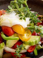 Βιολογικό αυγό, Παξιμάδι κρίθινο & χαρούπι, Ντομάτα, Ξύγαλο Σητείας